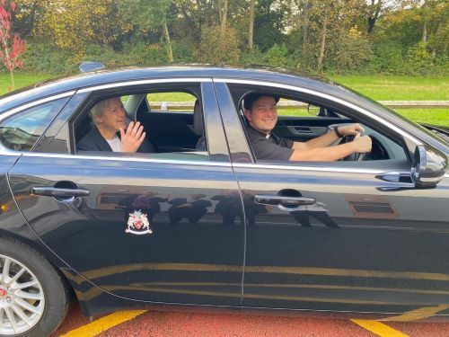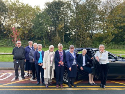 Manchester October 2023 – Sister Susan Molloy DC enjoyed a beautiful farewell tribute on her retirement from hospital chaplaincy after more than 25 years in ministry, leaving a legacy of compassionate service to patients and staff. Here she is in the Mayor’s Jaguar with the current chaplain playing chauffeur!